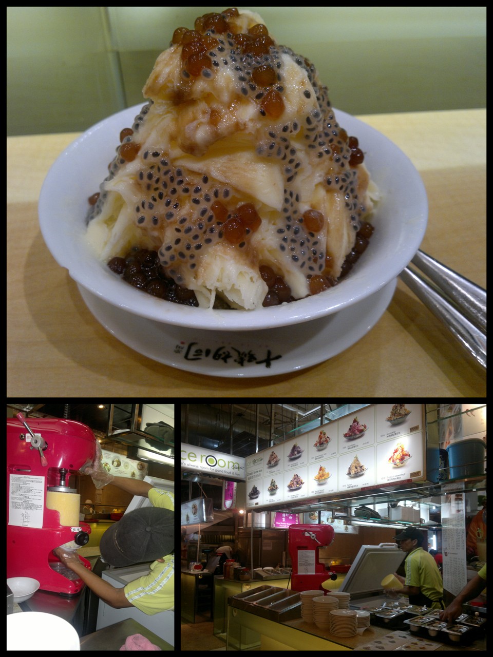 I think they also put some passion fruit on top of it. Can you see the black seeds with some juicy orange stuff? It tastes like passion fruit, sweet & sour. Thumbs up!